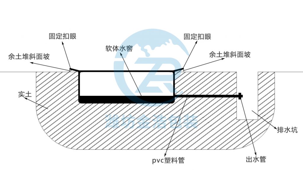 安裝水窖開(kāi)挖池體,池體深度比軟體水窖高度小5cm,將挖出余土在四周制作成斜面;斜面尺寸參考水窖安裝要求尺寸。