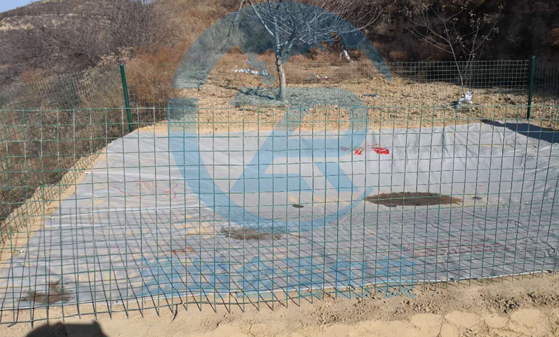將集水膜覆蓋在堆制斜坡面,用鐵桿將扣眼固定在地面。